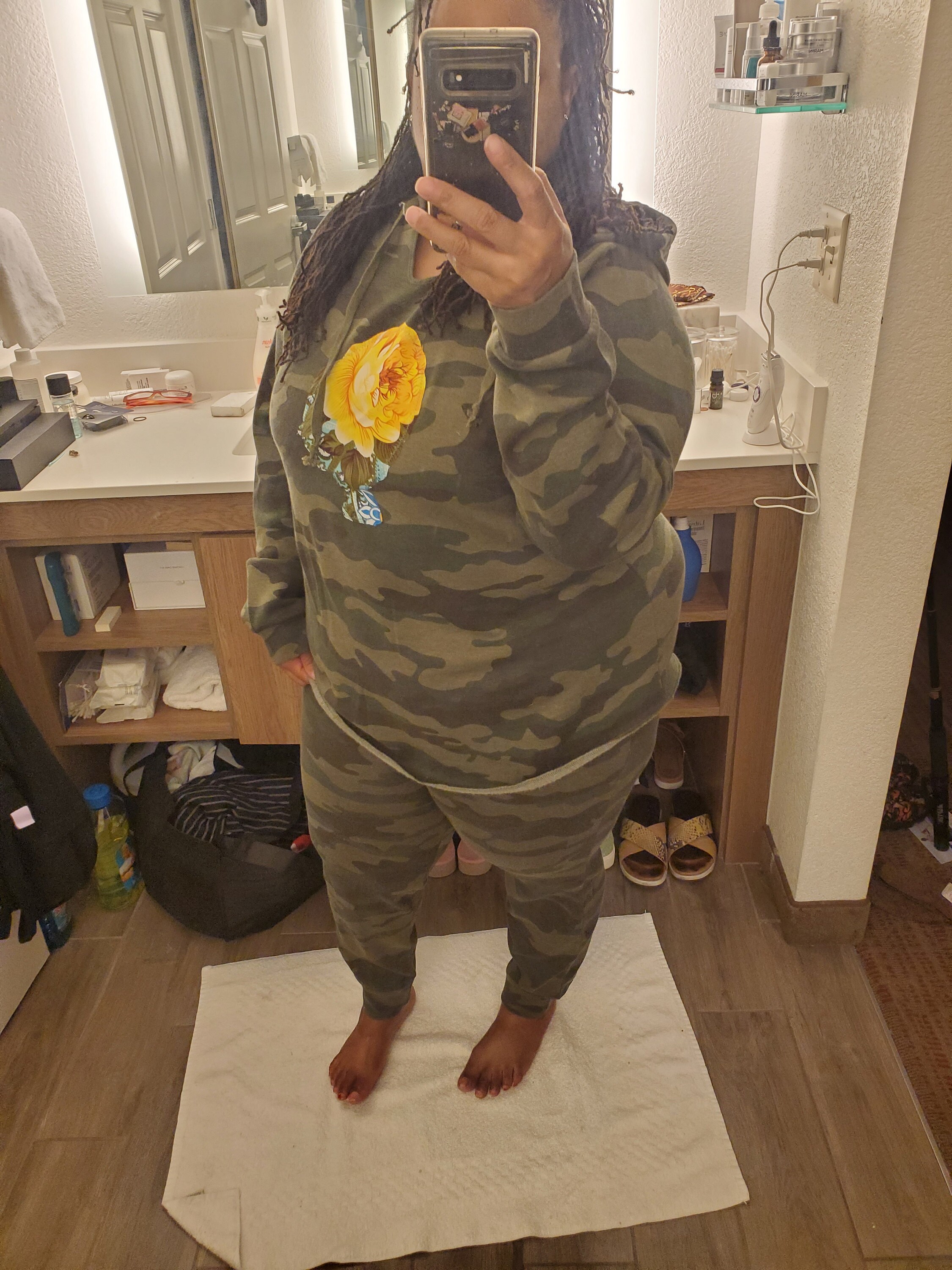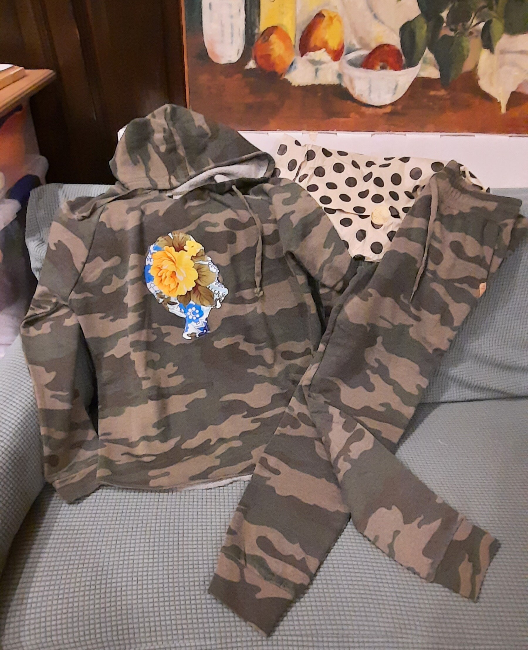 Camouflage with a girly twist this Fitted Jogger suit changes the game in camouflage. Fitted Hoodie with shirt tail hem has a floral Afro Girl spread. Fitted joggers have side pockets and draw string pull on pants. Both are made of fleece.